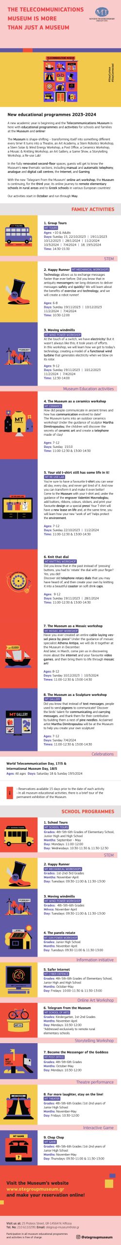 - School programs will include STEM education, storytelling workshops, theatrical performances, online art workshops for remote primary schools, knowledge and observation games, safe browsing seminars. All programmes are specially designed for students at all levels of elementary and junior high school, while school tours of both floors of the Museum are designed for elementary school students, junior high and high school students, and students at vocational training schools and academic institutions. Book here
